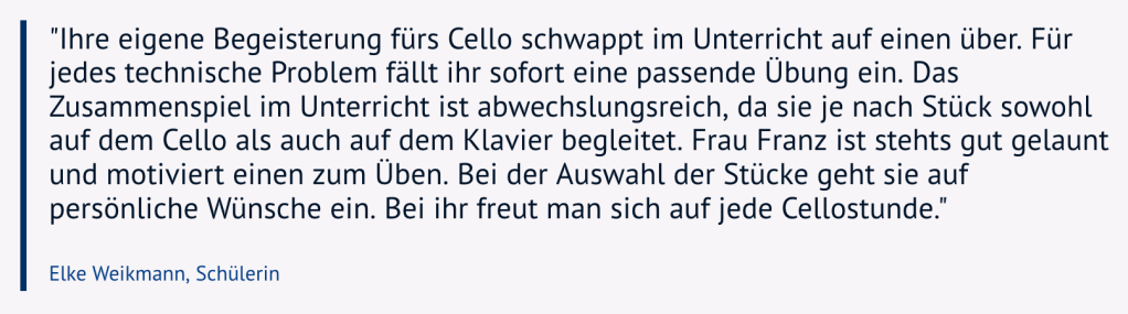 In meinem Unterricht ist es mir wichtig, sich auf Augenhöhe zu begegnen. Gemeinsam musikalische Interessen und deren Umsetzung auf dem Cello zu erforschen und auszuprobieren und dabei voneinander zu lernen, ist ein zentraler Bestandteil meines Unterrichtens.